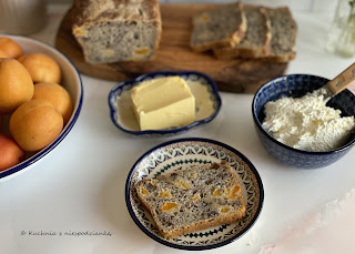 No i właśnie tak apetycznie brzmiała opowieść o jego chlebie z morelami, że postanowiłam spróbować upiec. Za bazę wzięłam mój wypróbowany chleb na zakwasie. Do niego zaś dołożyłam dodatki sugerowane przez Tomka. Nie był to pierwszy raz, gdy wykorzystywałam suszone owoce i orzechy w chlebie. Robiłam już chleb z rodzynkami i orzechami. Chleb z morelami jest ciekawy w smaku. Najlepszy jest zaraz po upieczeniu albo lekko, gdy masło się na nim rozpływa, a skórka lekko chrupie. Rewelacyjnie smakuje z serem kozim i z dżemem morelowym, który wzmacnia jego walory smakowe.